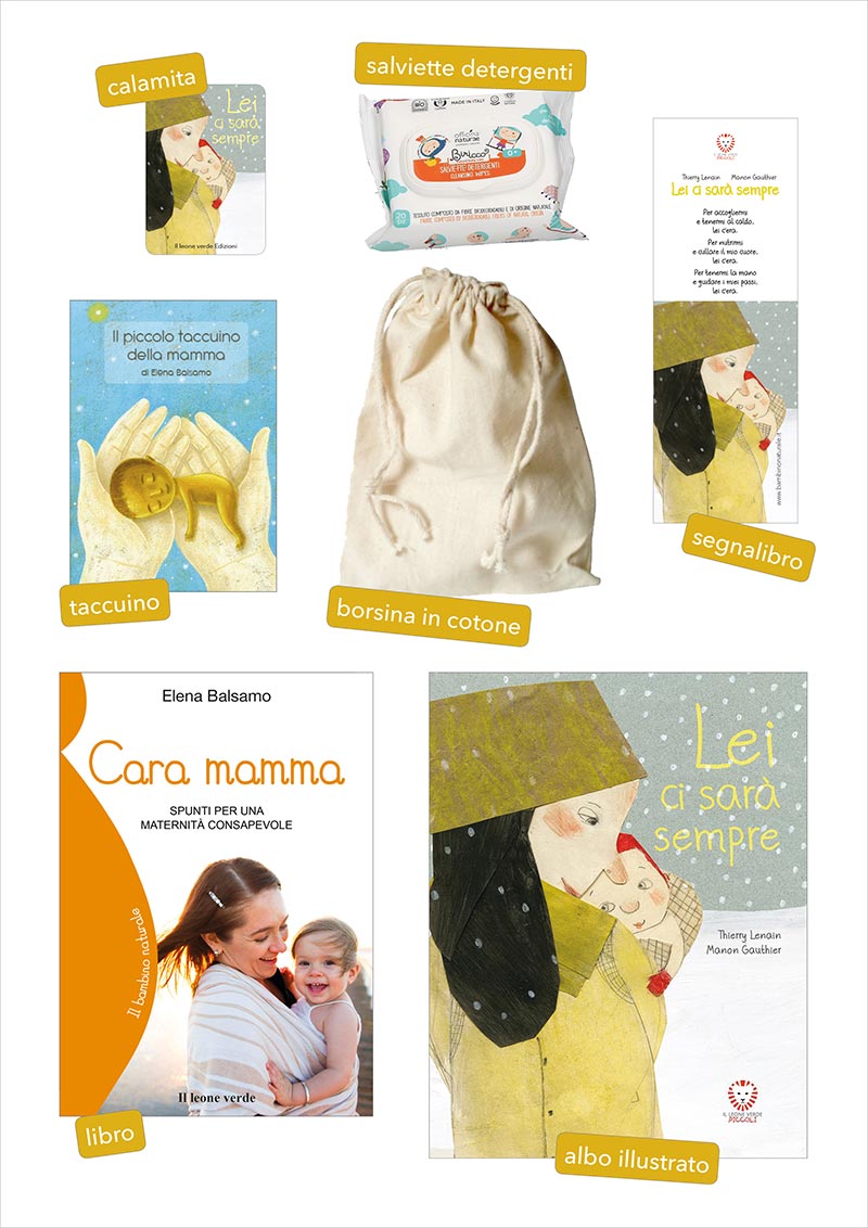 Libro, albo illustrato, taccuino e gadget racchiusi in una borsina in cotone 100% naturale.